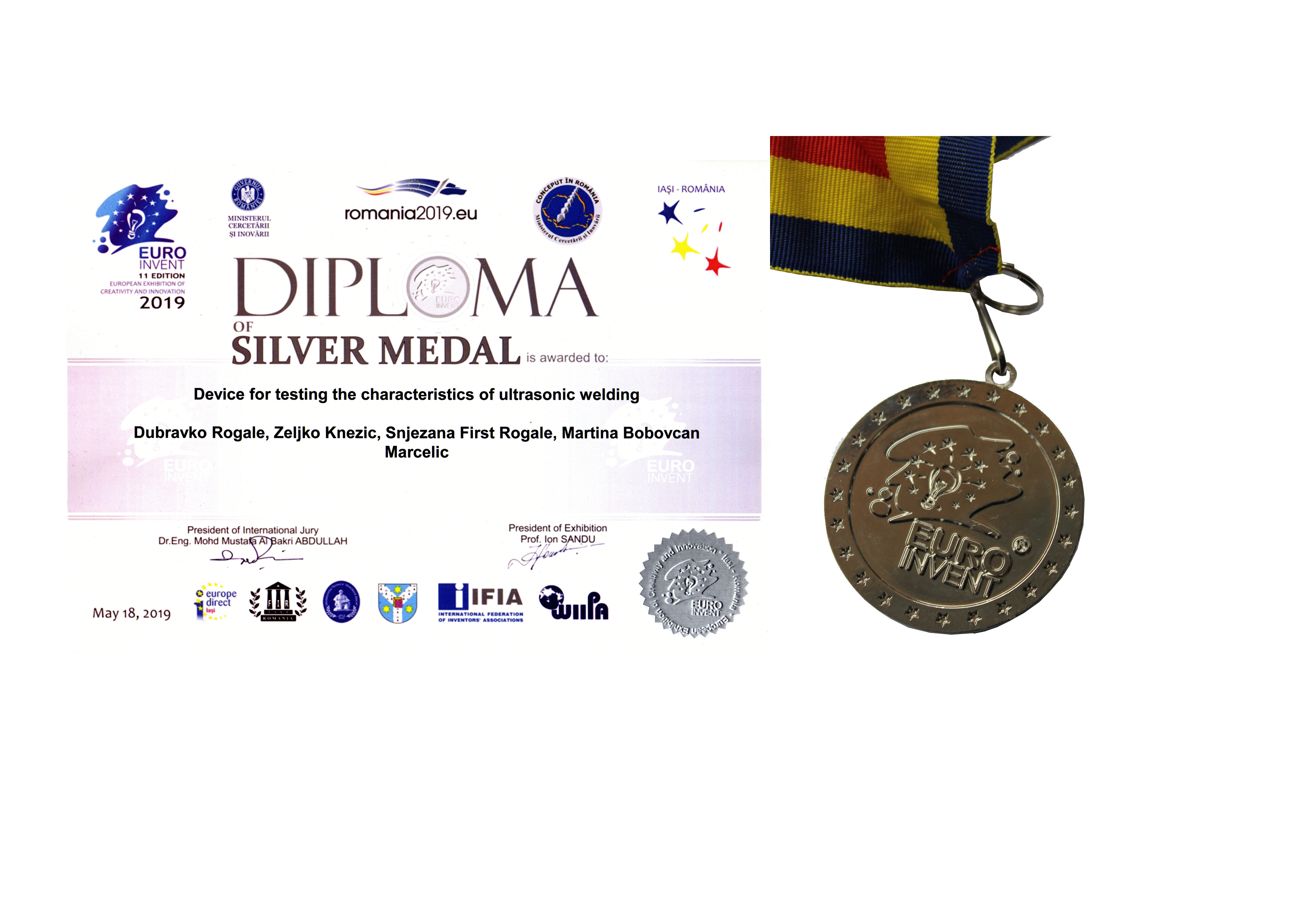 Uređaj za testiranje karakteristika ultrazvučnih spojeva autora Dubravka Rogalea, Željka Knezića, Snježane Firšt Rogale i Martine Bobovčan Marcelić nagrađen je srebrnom medaljom te medaljom Excellence Inovation Award za postizanje izvrsnosti u inovacijama kroz predanost i dosljednu želju da se pomiču granice onoga što se može postići kroz znanost i tehnologiju. Nagradu je uručio rektor University Politehnica of Bucharest profesor Mihnea Costoiu.
