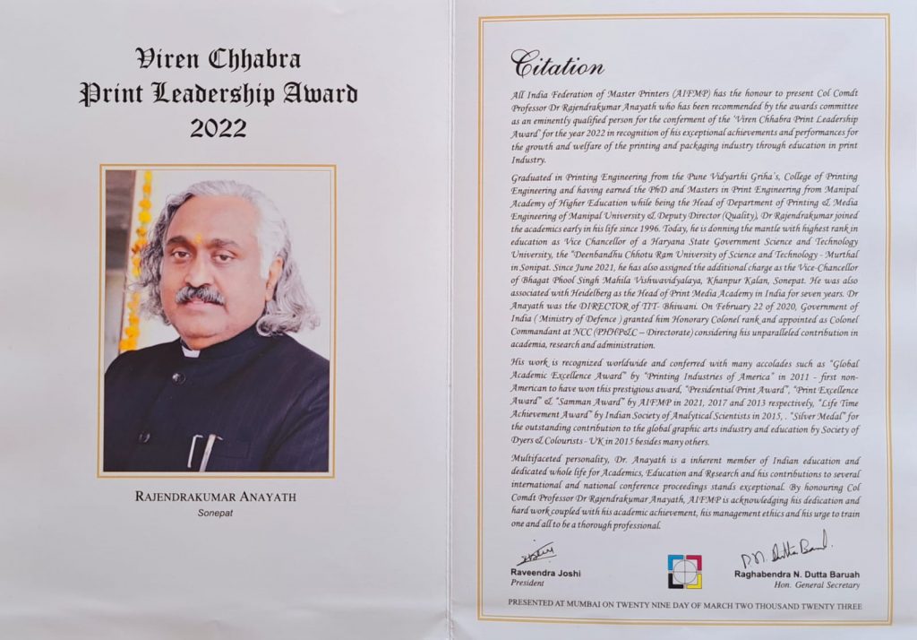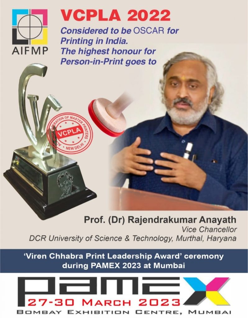 Međunarodni član Odjela grafičkog inženjerstva Akademije tehničkih znanosti Hrvatske Prof. dr. Rajendrakumar Anayath, sa University of Science & Technology, Murthal, Haryana osvojio je nagradu koja se smatra Oskarom za područje tiskarstva u Indiji.