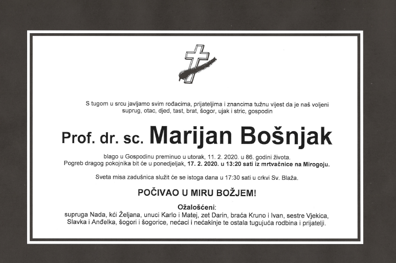 Prof. dr. sc. Marijan Bošnjak preminuo u utorak 11.2.2020. u 86. godini života.