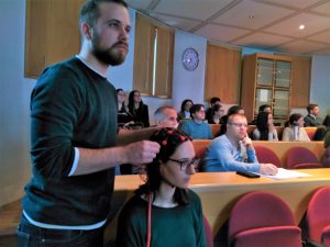 Krešimir Friganović, mag. ing. demonstrira korištenje prijenosnog elektroencefalografa.