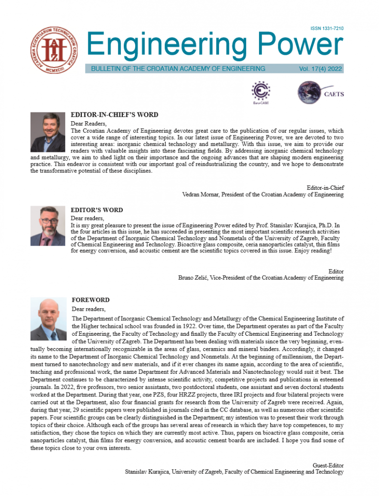 “Engineering Power” Vol. 17(4) 2022 Editor-in-Chief Vedran Mornar Editor Bruno Zelić Guest-Editor Stanislav Kurajica, University of Zagreb, Faculty of Chemical Engineering and Technology CONTENT Editors’ Words Preparation of chitosan-copper complex microspheres modified by bioactive glass Electrochemical and catalytic applications of cerium(IV) oxide Showcase of tools for preparing, modifying […]