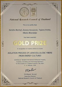 Inovacija pod nazivom Postupak proizvodnje lignoceluloznih vlakana iz energetskih kultura  prof. dr. sc. Sandre Bischof, doc. dr. sc. Zorane Kovačević sa Tekstilno-tehnološkog fakulteta u suradnji sa prof. dr. sc. Tatjanom Krička, te izv. prof. dr.sc. Nikolom Bilandžijom sa Agronomskog fakulteta nagrađena je od National Research Council of Thailand  sa Gold Prize.