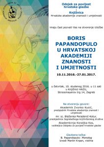 U organizaciji Odsjeka za povijest hrvatske glazbe i Knjižnice HAZU 10. studenoga 2016. održat će se otvorenje izložbe “BORIS PAPANDOPULO U HRVATSKOJ AKADEMIJI ZNANOSTI I UMJETNOSTI” u Knjižnici HAZU u Zagrebu.