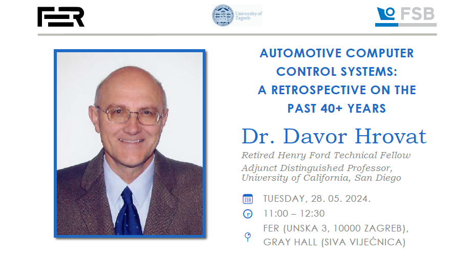 U utorak, 28. svibnja 2024. u 11 sati u Sivoj vijećnici Fakulteta elektrotehnike i računarstva (FER), Unska 3, Zagreb održat će se predavanje Automotive Computer Control Systems: A Retrospektive on the Past 40+ Years dr. Davora Hrovata, umirovljenog Henry Ford Technical Fellow, člana National Academy of Engineering i Adjunct Distinguished Professor na University of California, San Diego.