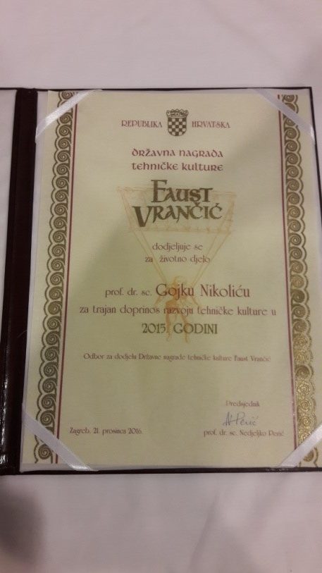 Državnom nagradom tehničke kulture „Faust Vrančić“ za životno djelo za 2015. god. nagrađen je prof. dr. sc. Gojko Nikolić, umirovljeni redoviti profesor u trajnom zvanju, za doprinos razvitku tehnologije i tehničkog stvaralaštva u Republici Hrvatskoj s posebnim naglaskom na unaprjeđenje tehnike inovativnim razvojem i primjenom novih rješenja, uređaja i tehnologija koje su se njegovim zalaganjem primijenile u industriji. Nagrada mu je predana 21.12. 2016. na svečanosti u Ministarstvu znanosti i obrazovanja.